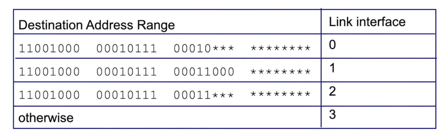 - 예시에서는 11001000 … 00000000 부터 11001000 … 11111111까지는 link interface 0번으로 보낸다