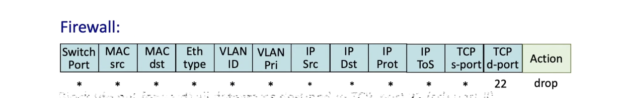 - TCP destination 포트 22인 datagram은 (match) drop한다 (action)