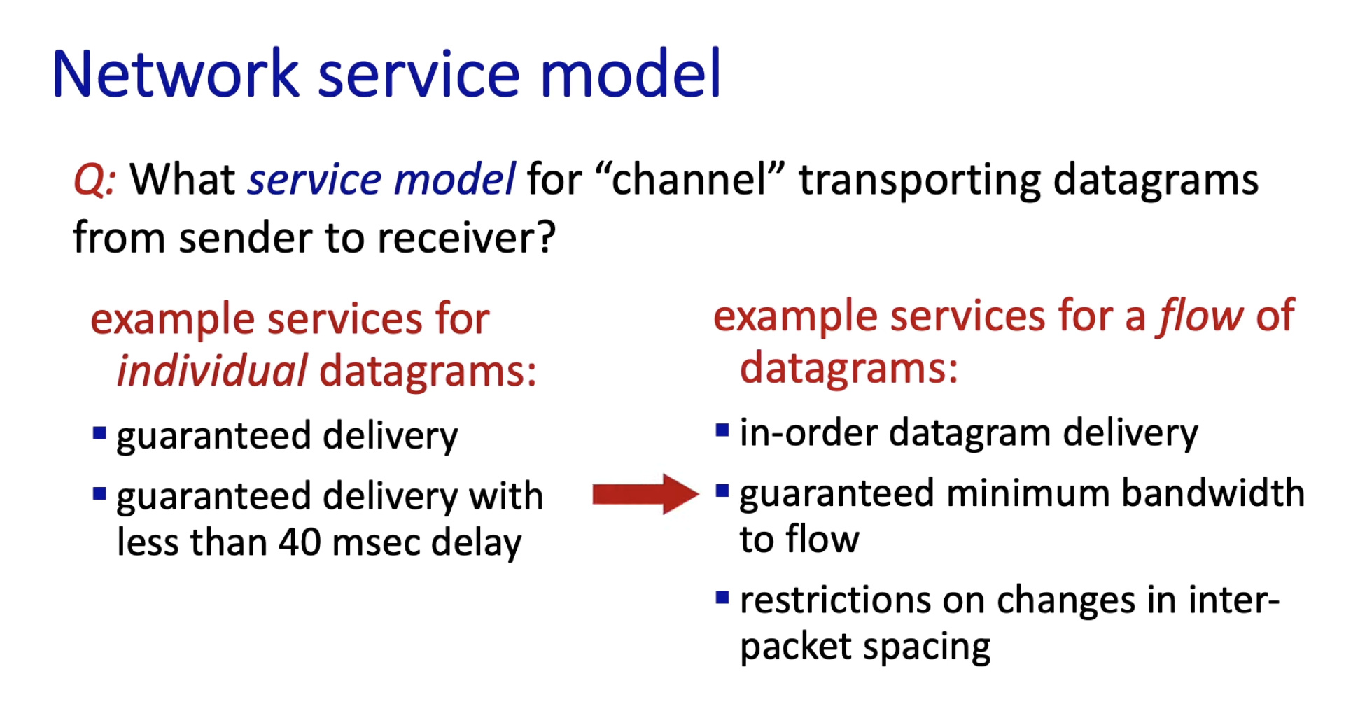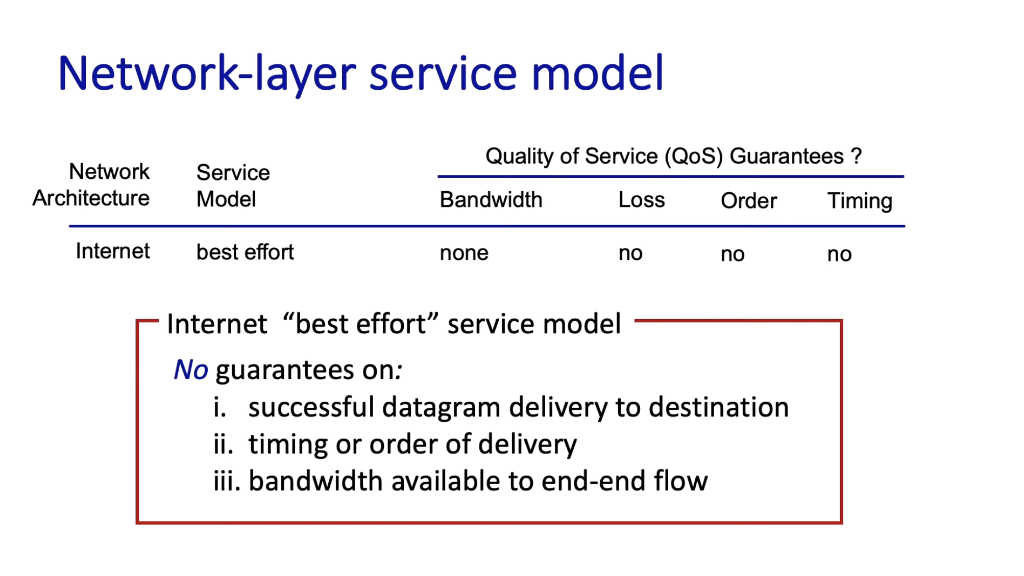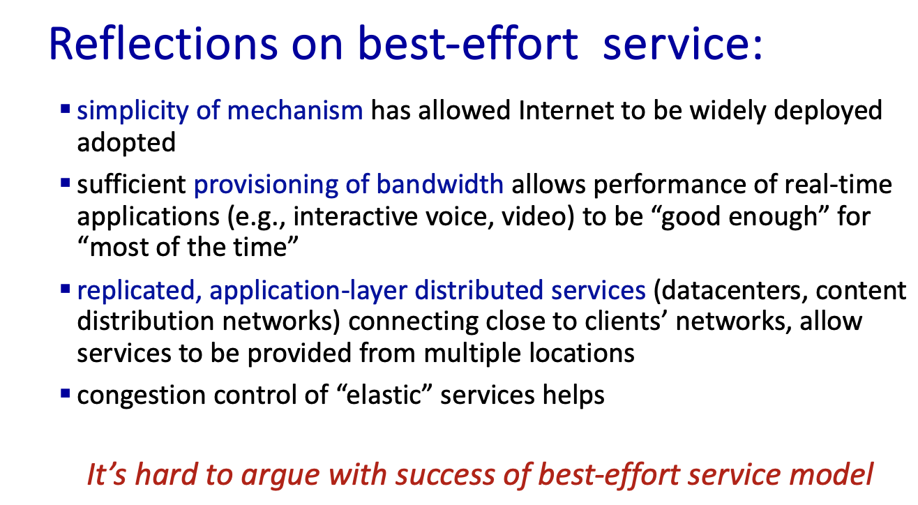 - "best effort" service는 여러가지 항목을 보장 못하지만 모델이 간단하여 넓게 채택 받았다