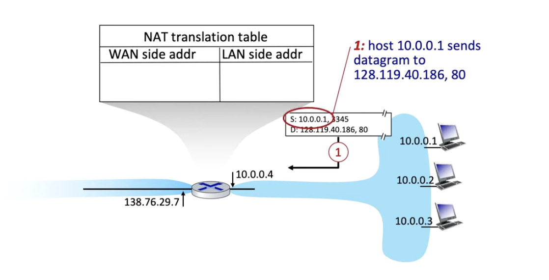 datagram이 NAT 라우터에 도착하면 (IP 10.0.0.1, 포트 3345)를 (NAT IP 138.76.29.7, 포트 5001)로 바꾸고 NAT translation table에 기록한다