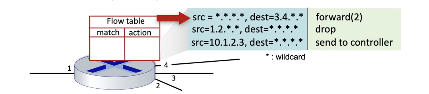 - Generalized forwarding에서는 destination IP 뿐만 아니라 다른 header 필드 값도 비교하여 forward한다 (match + action)