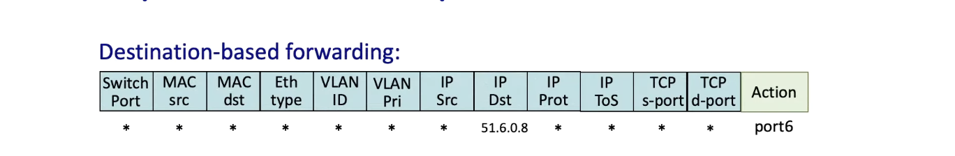 - Destination IP 주소가 51.6.08인 datagram은 (match) 6번 포트로 보내기 (action)