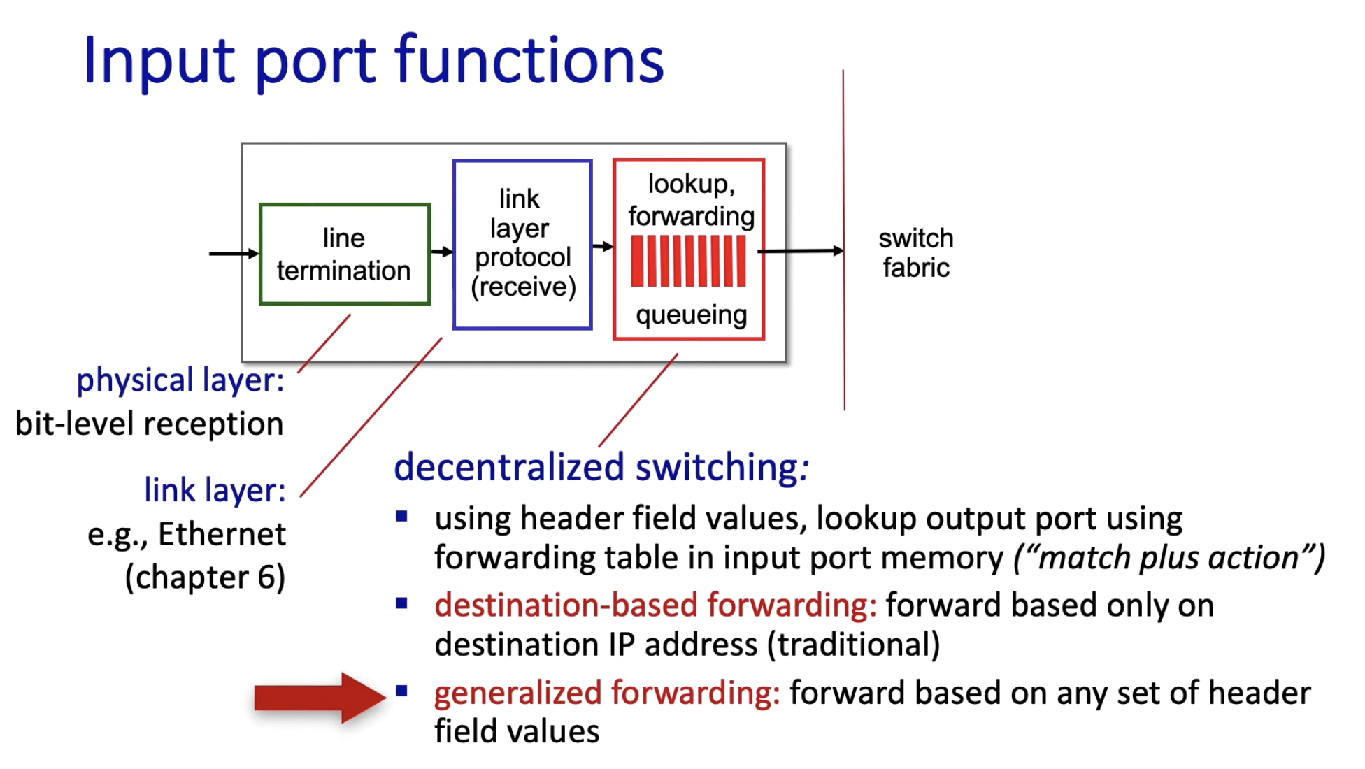 - Physical Layer (line termination)-> Link Layer -> Queue -> Switch fabric순으로 맨밑 계층부터 Network Layer로 packet이 올라온다