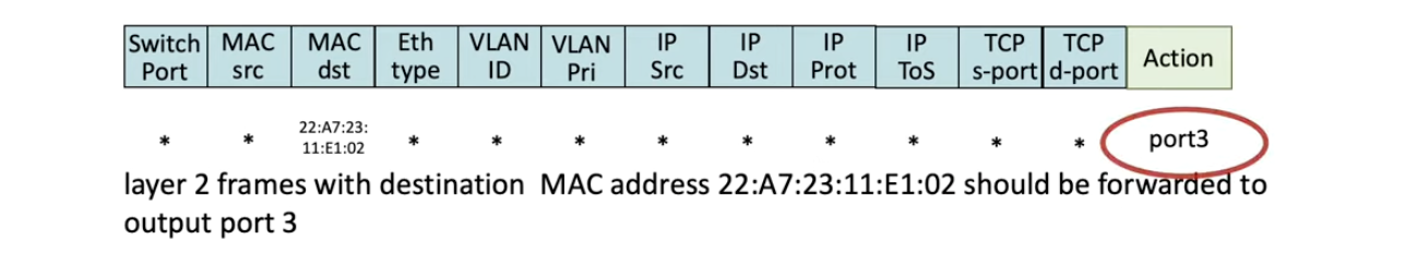 - Destination 주소가 22:A7:23:11:E1:02인 frame은 (match) 3번 포트로 보내기 (action)