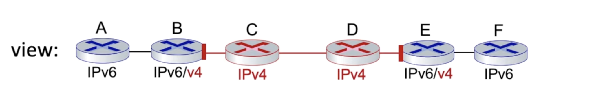 - 중간에 IPv4 라우터들이 있어 tunneling을 해줄 IPv6/v4 라우터가 사이에 두개 필요하다