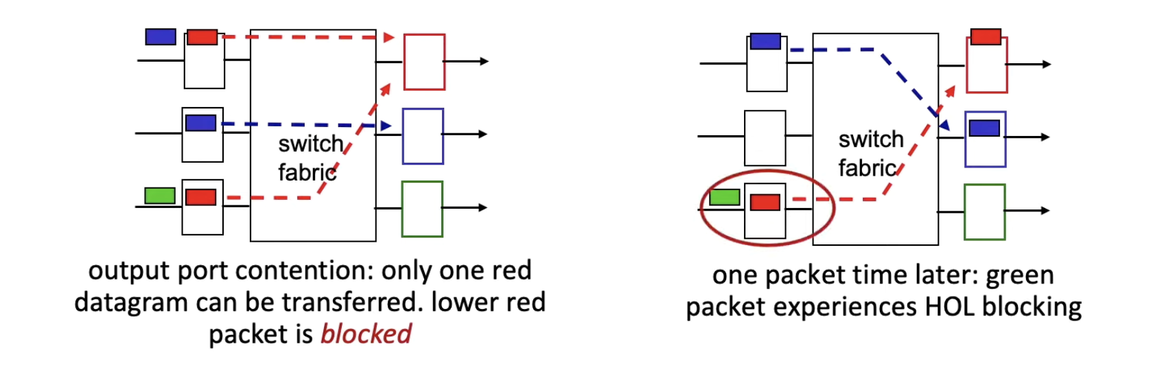 Head-of-the-Line (HOL) blocking은 input 버퍼 맨앞에 큐잉중인 packet 때문에 그 뒤에 있는 packet들이 앞으로 못가는 현상이다