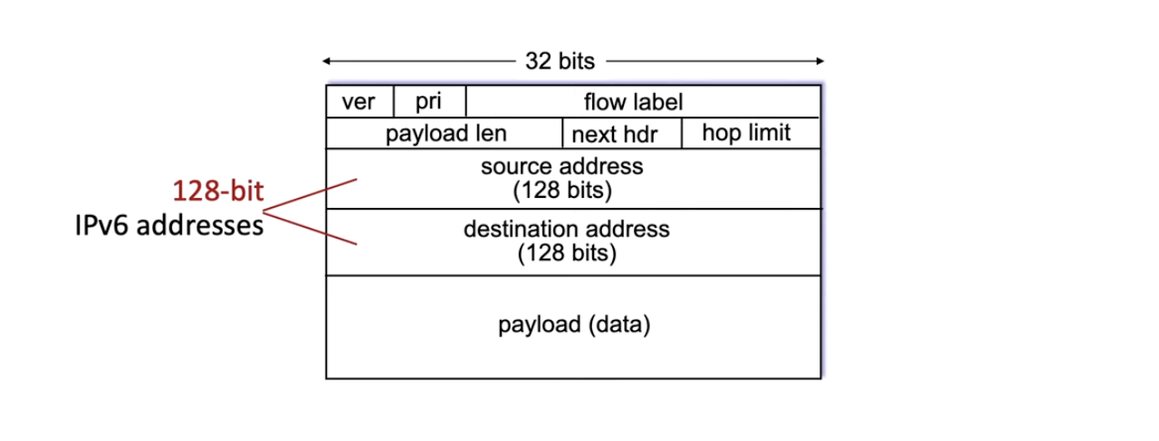 - source/destination address: 기존의 32 bit를 128 bit 주소 공간으로 늘렸다