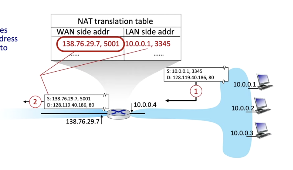 - 외부에서 datagram이 들어오면 NAT translation table를 참고하여 (NAT IP 주소, port 번호)를 (source IP 주소, port 번호)로 바꾼다