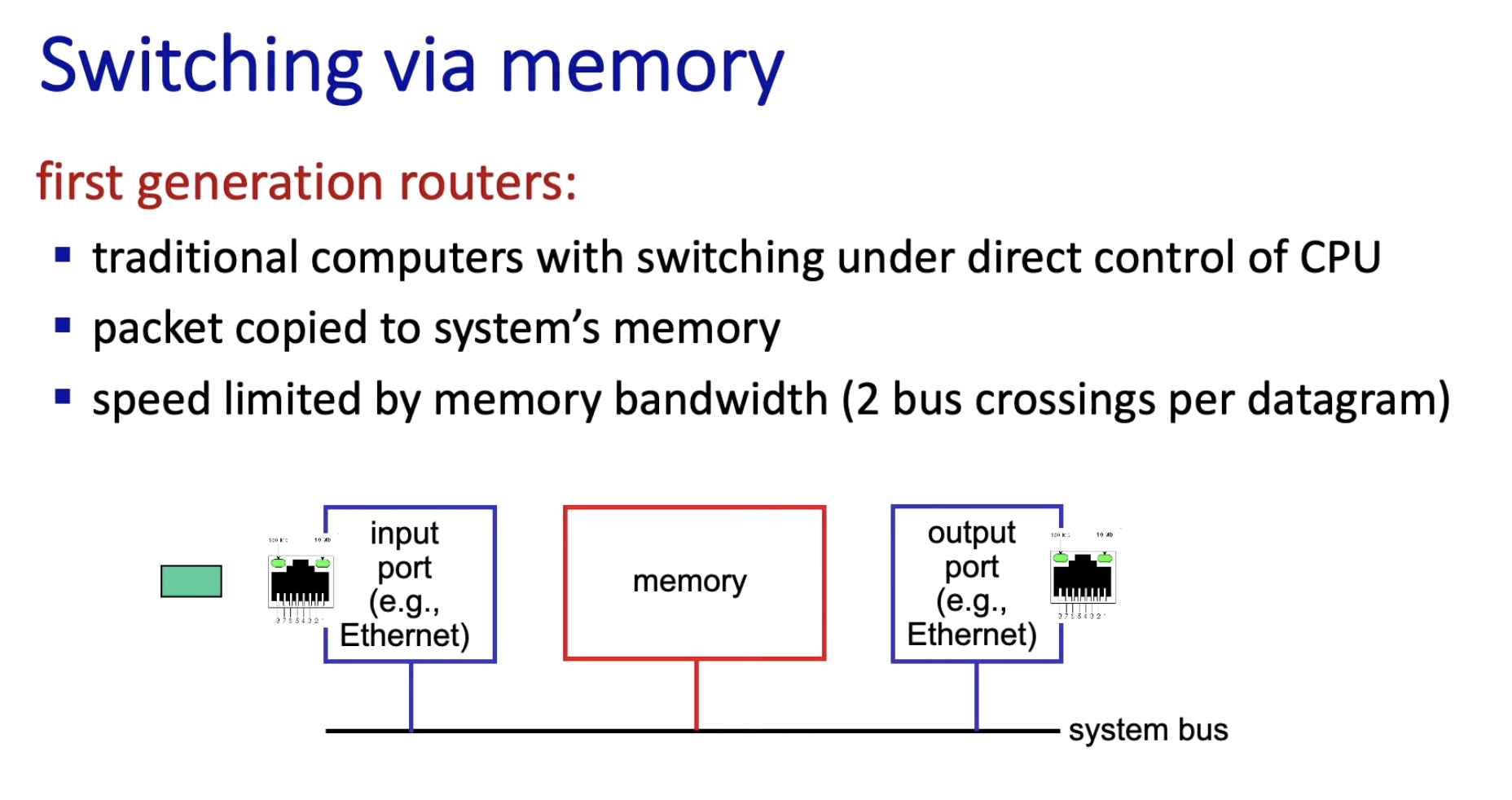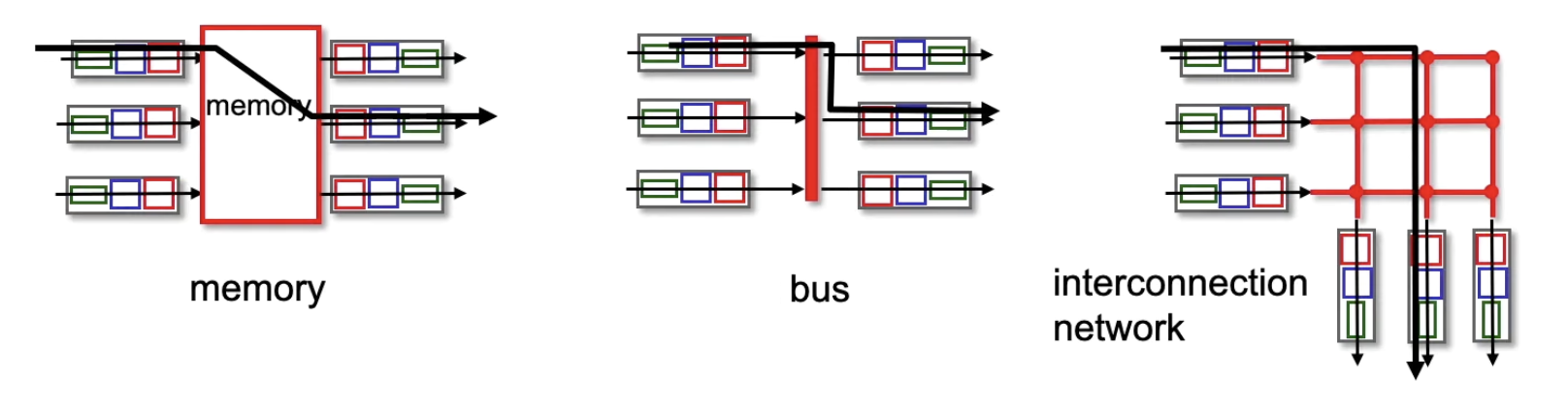 - Switching via memory, bus, interconnection network