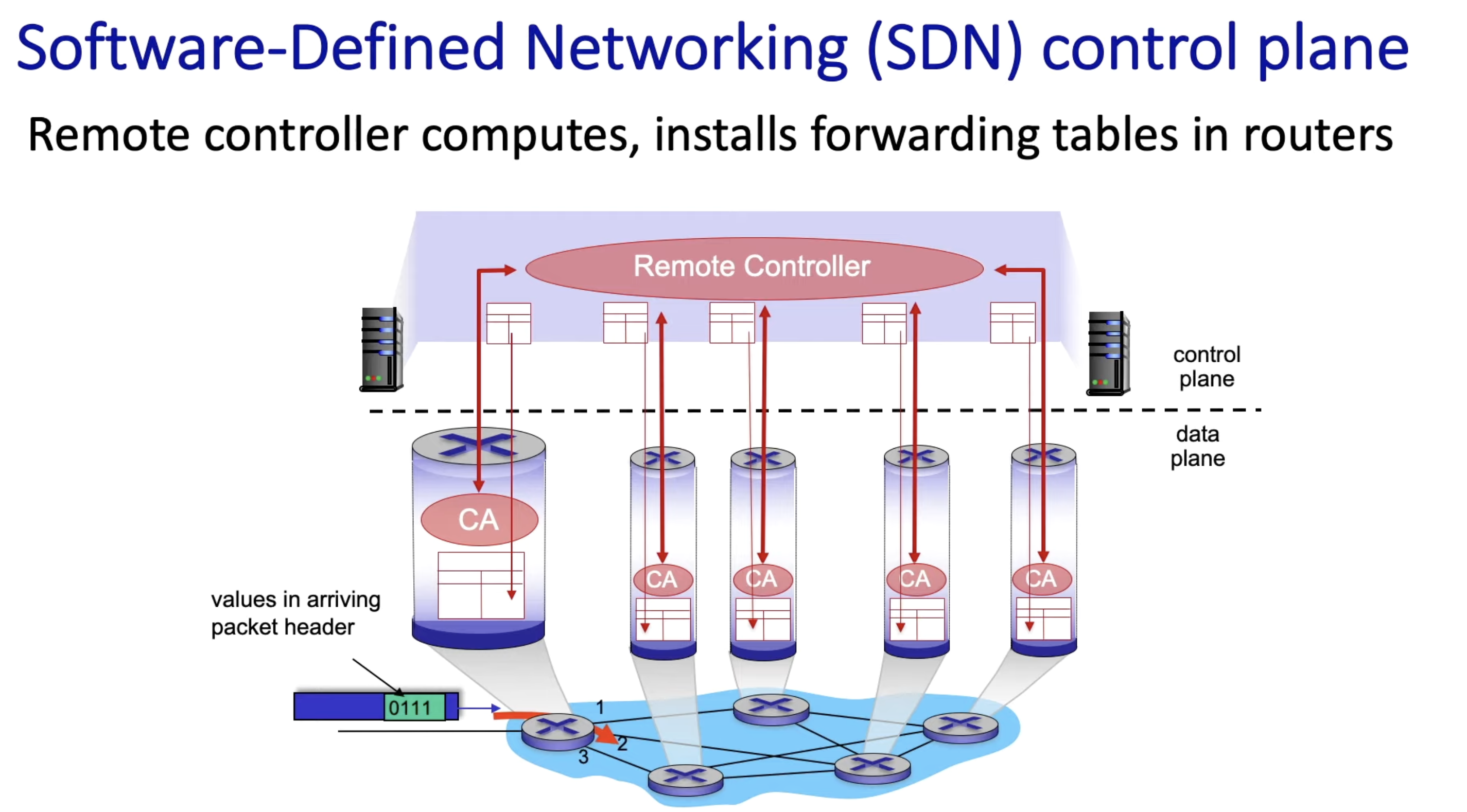 - SDN은 중앙화된 Remote Controller에서 계산하고 forwarding table (flow table)을 만들어 라우터들에게 전달하는 방식이다