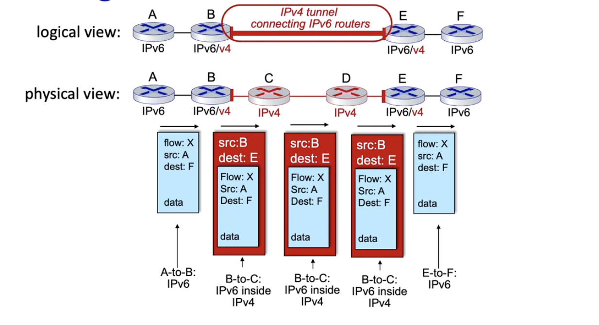 - 결과적으로 tunneling을 통해 A에서 IPv6 datagram이 IPv4 라우터들을 통과해 F로 도착한다