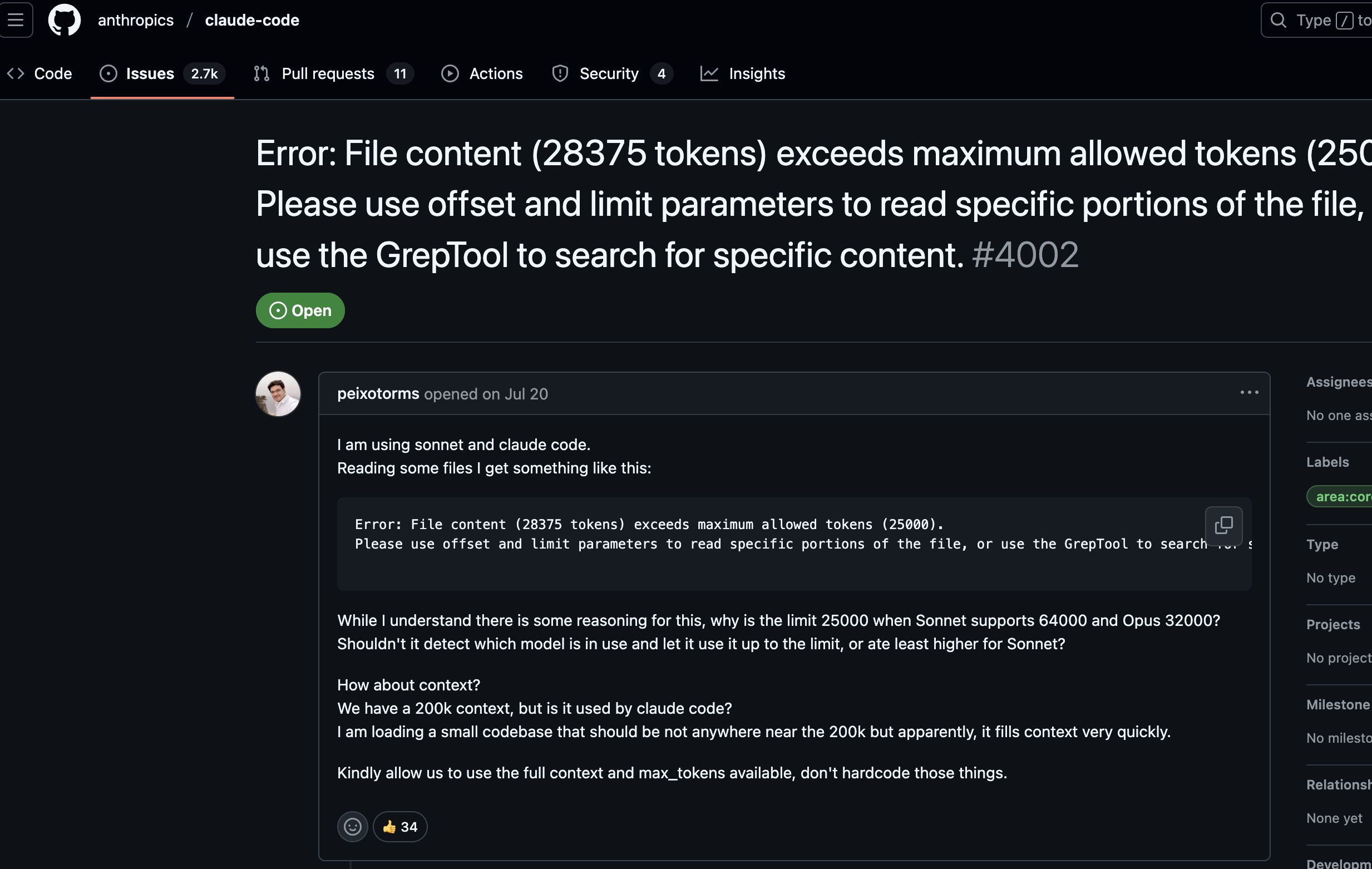 어느날 나를 찾아온(내 화면 캡쳐를 깜빡해서 동일한 에러 터진사람의 github issue)파일이 너무 길어서 토큰이 부족하다는 에러 https://github.com/anthropics/claude-code/issues/4002