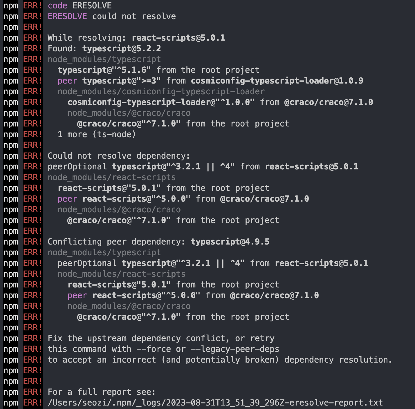 그리고 해결책으로 명령어 실행시 --force 나 --legacy-peer-deps 커맨드를 추가하라는 코멘트도 주고 있군요. 이 부분은 아래에서 좀 더 다루겠습니다. (이래서 오류메세지를 자세히 읽는 게 중요하네요!)