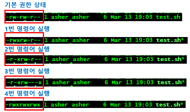 chmod ugo=rwx test.sh # 4번 모든 사용자에게 읽기, 쓰기, 실행 권한 부여