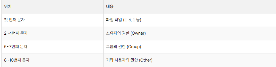 리눅스에서는 파일 권한이 10개의 문자로 구성된 표기로 나타납니다.