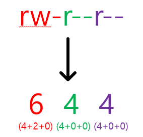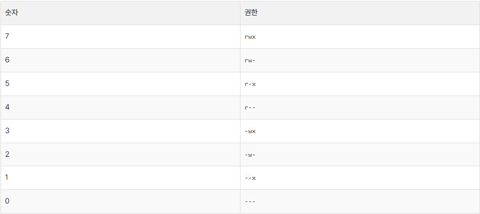 위에는 r , w , x , - 의 4가지 형태로 10자리 표현이 되었다면, 숫자 형태는 3자리로 표현됩니다