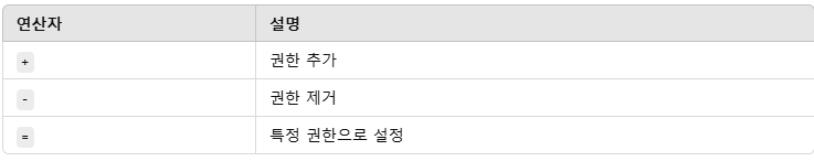 기호를 통해 특정 권한을 부여하거나 제거 할 수 있습니다.