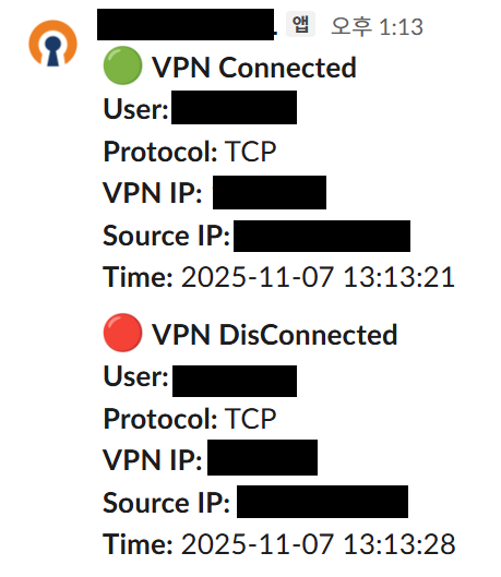 # Description: VPN 접속해제 시 user,ip,protocol,time 등의 정보를