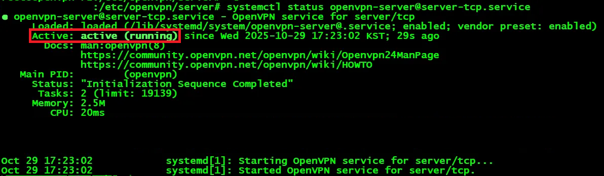 systemctl을 이용하여 VPN-TCP 서비스 등록 및 서비스 시작
