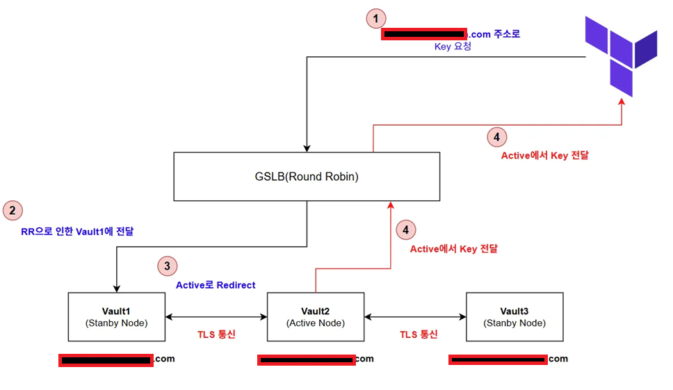 GSLB를 통해 어디로 통신이 되든 Stanby Node는 Active Node로 요청을 Redirect 하기 때문에, 만약 Vault 2번이 장애가 나도 GSLB는 장애가 난 Node에게는 요청을 보내지 않기 때문에 서로 통신이 가능합니다.