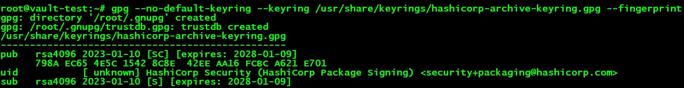 sudo apt update && sudo apt install gpg wgetwget -O- https://apt.releases.hashicorp.com/gpg | sudo gpg --dearmor -o /usr/share/keyrings/hashicorp-archive-keyring.gpggpg --no-default-keyring --keyring /usr/share/keyrings/hashicorp-archive-keyring.gpg --fingerprint