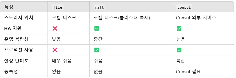 | 멀티 백엔드 저장소 지원 | AWS S3, 파일 시스템, Consul, PostgreSQL 등 다양한 스토리지 백엔드를 사용 가능 |