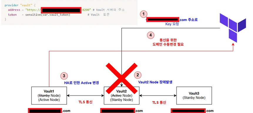 Vault 2번으로 Terraform은 주소를 알고 있지만 장애가 발생하여 HA 구성을 통해 Vault 1번으로 Active Node로 전환 되었을 때 Terraform과 Vault Cluster는 통신이 불가합니다.