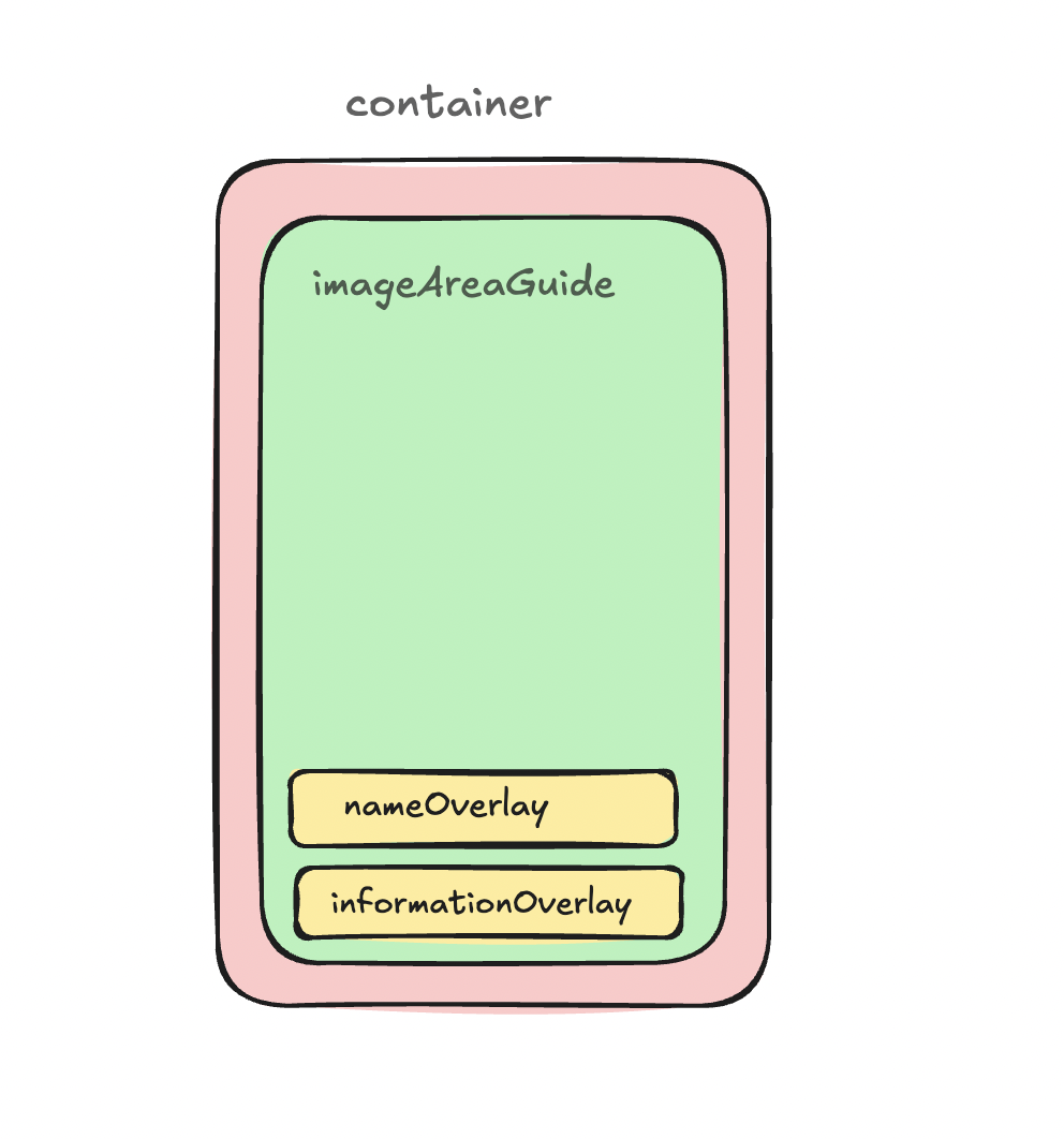 imageAreaGuide: 이름(nameOverlay)과 하단 정보(informationOverlay)를 묶어서 이미지 내부의 특정 위치(예: 하트 장식 옆)에 배치하기 위한 기준점(Anchor) 역할을 수행하려 했습니다.