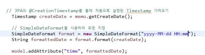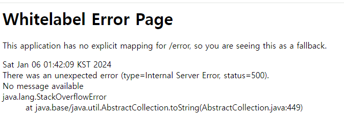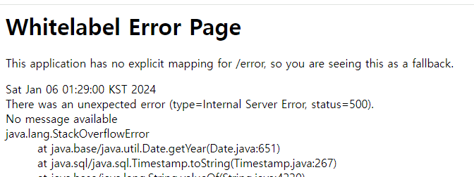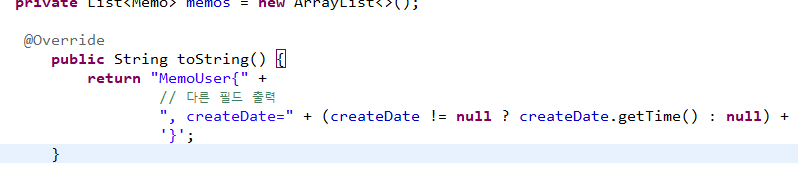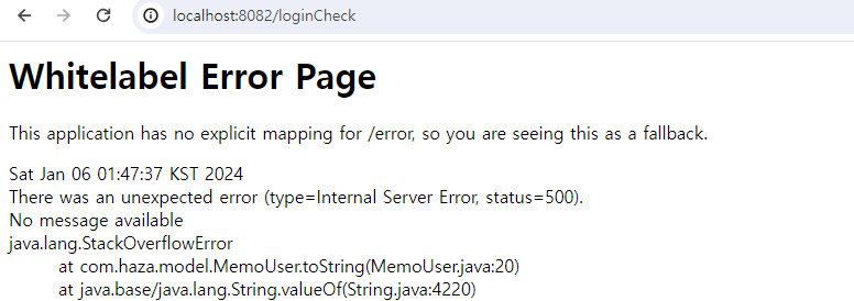 java.sql.Timestamp의 toString 메서드를 사용할 때 이로 인해 MemoUser 클래스의 toString 메서드에서 Timestamp 객체를 문자열로 변환할 때 스택 오버플로우가 발생하지 않도록 Timestamp 객체를 적절하게 다루게끔 MemoUser 클래스의 toString 메서드를 수정한다.