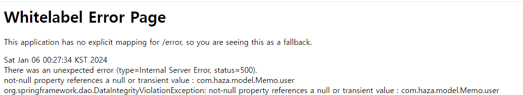 Memo 엔터티에서 user 필드가 null인 채로 저장을 시도하고 있다.