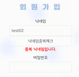 스크립트로 중복 닉네임일 경우를 알려주고 제출을 하기 전에 막을 수 있어야 한다.