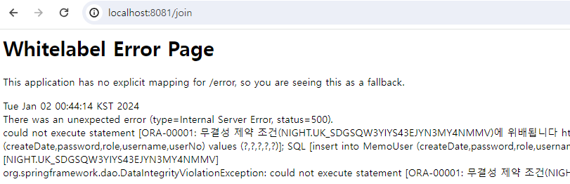 중복 닉네임으로 가입을 시도하면 위배 조건에 위반 에러가 나타난다.