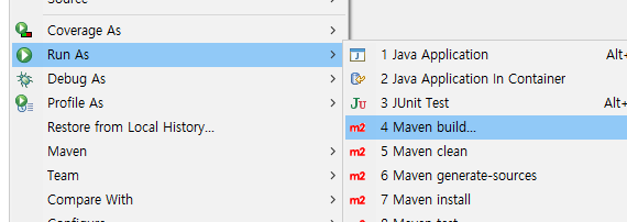 프로젝트 우클릭 - > run as - > maven build
