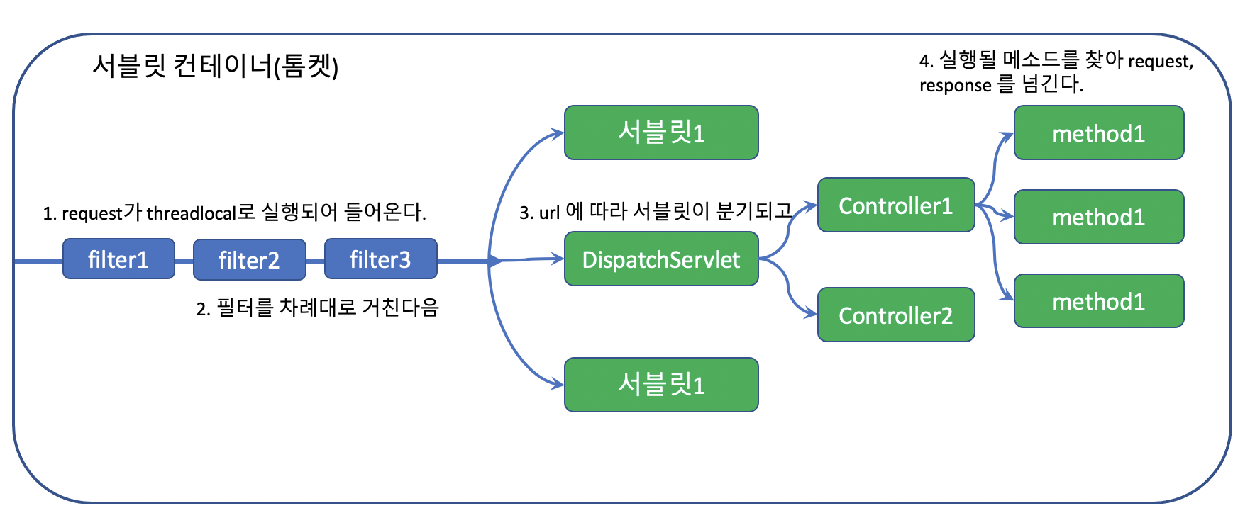 컨트롤러의 메소드에 URL을 매핑을 해서 웹 리퀘스트가 그 메소드를 찾아가게 하는 방법은 바로 dispathcServlet때문인데, dispathcServlet은 등록된 컨트롤러와 메소드들에서 URL과 매칭이 되는 메소드를 찾아서 실행시켜주는 역할을 한다.