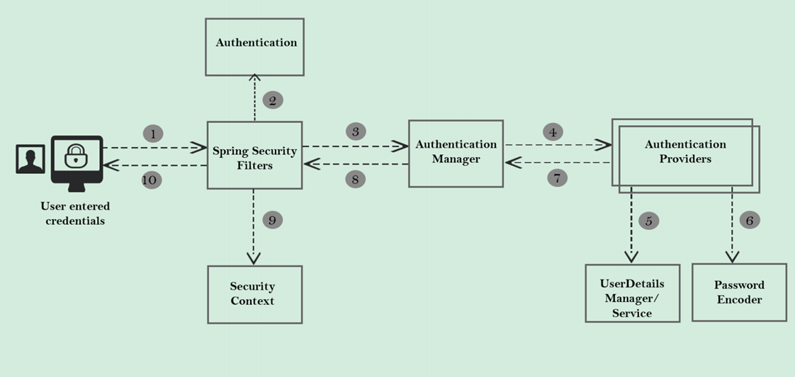 스프링 시큐리티에서 Authentication은 Authorization으로 구성이 된다. 필터들 중에 일부 필터는 인증 정보에 관여한다. 이들 필터가 하는 일은 AuthenticationManager 를 통해 Authentication 을 인증하고 그 결과를 SecurityContextHolder 에 넣어주는 일입니다.