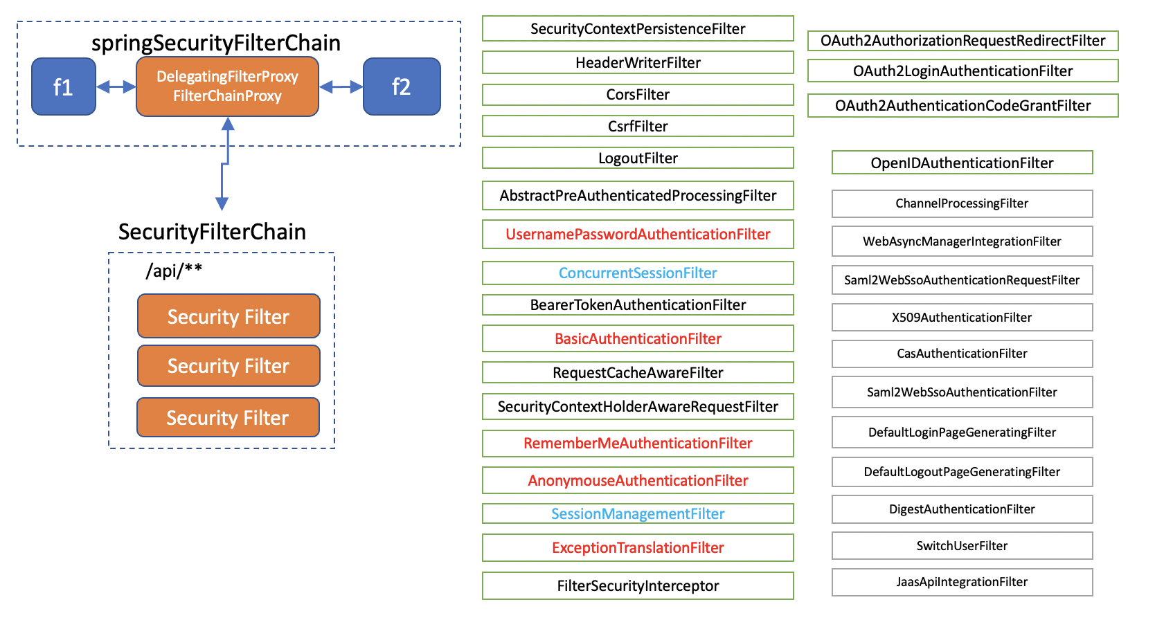 시큐리티 필터체인에 어떤 필터들을 넣을수있는가 ? 하는것이 시큐리티의 가장 큰 부분이기도 하다 스프링 시큐리티 라이브러리가 제공해주는 라이브러리가 많고, 대부분의 필터는 각각 다른 관심사를 필터링한다.