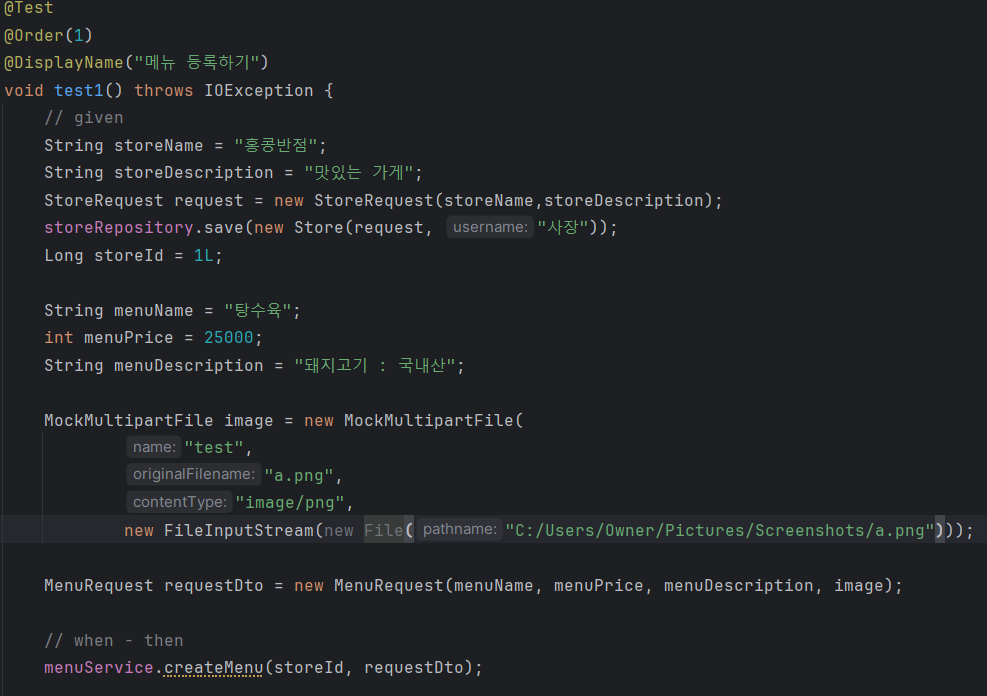 이미지가 추가된 메뉴를 등록하는 서비스 테스트를 하다가 에러가 발생했다.