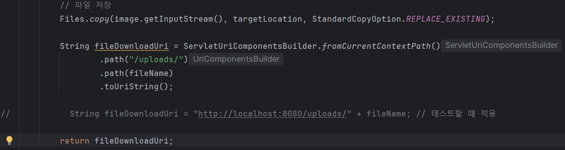 잘 해결이 안되서 구글링을 통해 알아보니 이미지를 업로드하고 url을 가져올 때 사용되는 fromCurrentContextPath()는 현재 실행 중인 애플리케이션이 서블릿 컨테이너에서 실행 중일 때는 제대로 작동한다고 하지만 일반적인 테스트에서는 서블릿 컨테이너가 실행되지 않아서 해당 메서드를 사용할 수 없다고 한다.