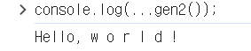 gen2() 함수를 호출해서 Generator 객체를 반환 받는다. 이때, 전개구문을 사용하여 iterable한 Generator 객체에서 값을 모두 꺼내어 개별 요소로 나열한다. 이때 개별 요소란 yield의 값을 말한다. 따라서, "Hello,"부터 "!"까지 반환되어 출력된 것을 볼 수 있다.
