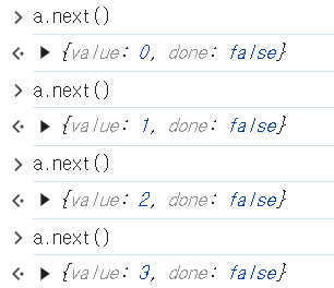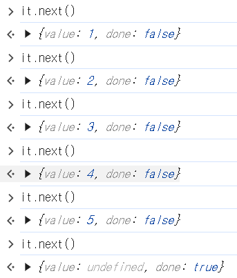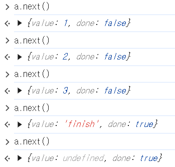 done은 Generator 함수 코드가 끝났는지를 나타낸다. Generator 함수 코드가 끝난 상태에서 next() 메서드를 호출하면 더 이상 표현할 값이 없기에 value는 undefined를 가지고, done은 true 값을 가진다.