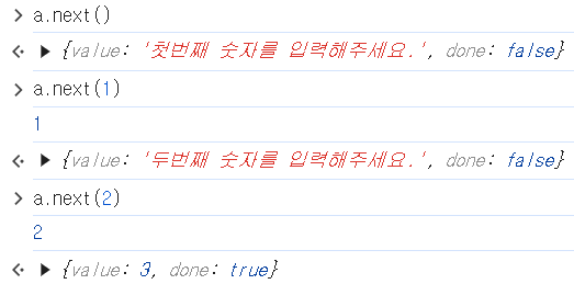 const num1 = yield "첫번째 숫자를 입력해주세요.";