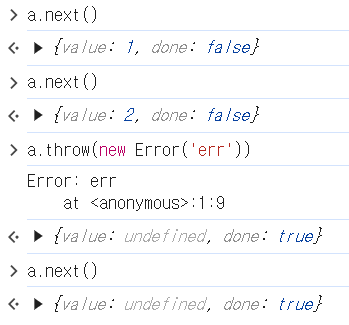 오류를 던지면 catch문에 있는 내용이 실행된다. 만약, catch문 안에 yield가 있고 함수 코드가 아직 끝나지 않았다면, throw()는 value를 yield의 반환값으로 하고 done을 false로 하는 데이터 객체를 반환한다.