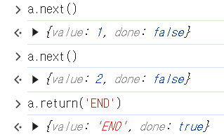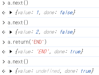 Generator 객체의 인스턴스 메서드 return()을 호출하면 반환되는 데이터 객체의 done 속성은 true인 값을 가진다. 반환된 객체의 value는 return() 함수의 인자가 된다.