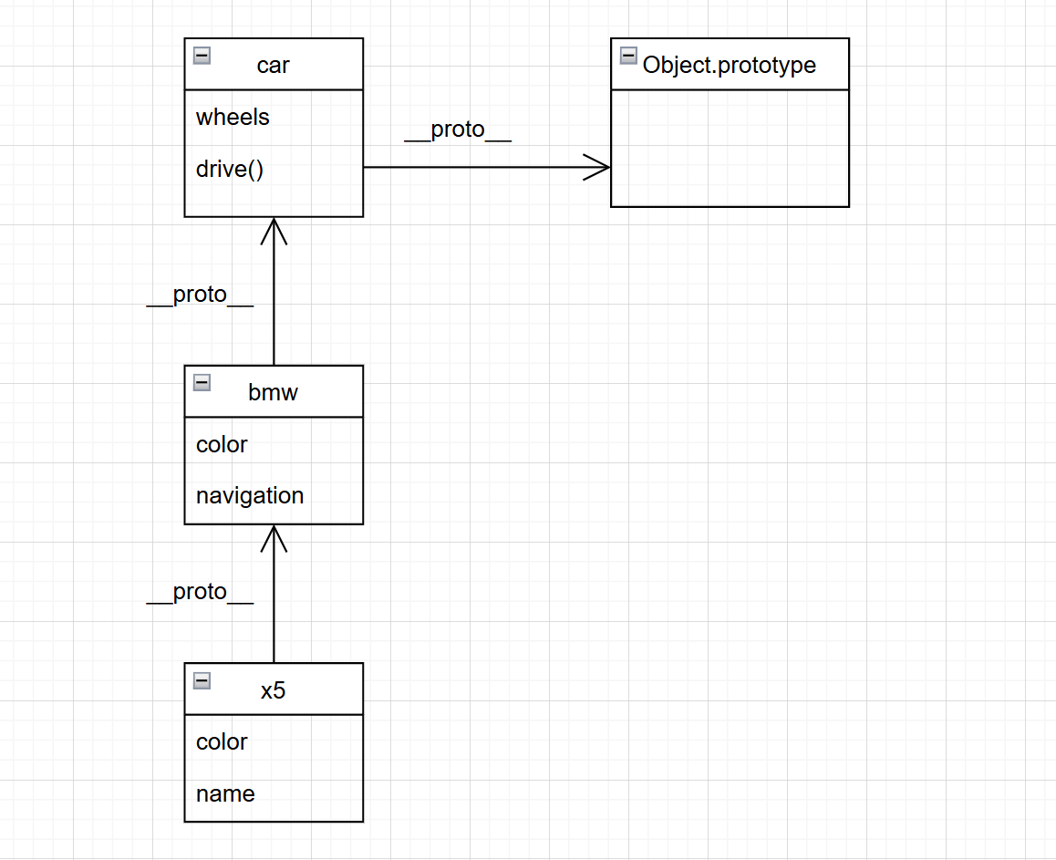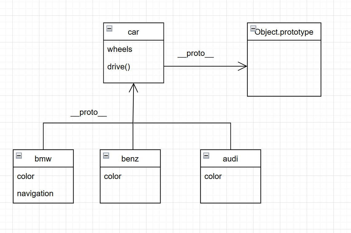 대략적인 클래스 다이어그램으로 나타내면 위와 같다. 함수를 제외한 모든 객체는 생성되면 __proto__ 속성을 가진다. 이때 __proto__ 속성은 상속 받을 객체를 가리킨다. bmw, benz, audi 객체는 car라는 객체를 상속받기 때문에 __proto__ 속성은 car 객체를 가리킨다. 그리고, 모든 객체는 Object.prototype이라는 객체를 상속 받는다. 따라서 car 객체의 __proto__ 속성은 Object.prototype 객체를 가리켜 상속받는다.