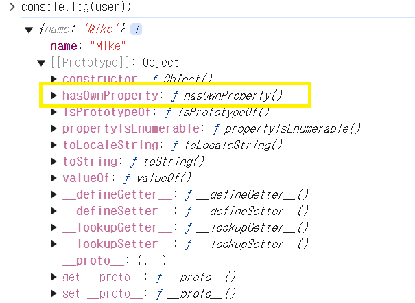 hasOwnProperty() 메서드는 객체가 직접 가지고 있는 프로퍼티가 맞는지 여부를 알려준다. user 객체에서 hasOwnProperty() 메서드를 만들어준 적이 없는데, 어떻게 사용이 가능할까? 이는 user 객체가 Object.prototype 객체를 상속 받기 때문이다. 즉, hasOwnProperty() 메서드는 Object.prototype 객체에 존재한다.