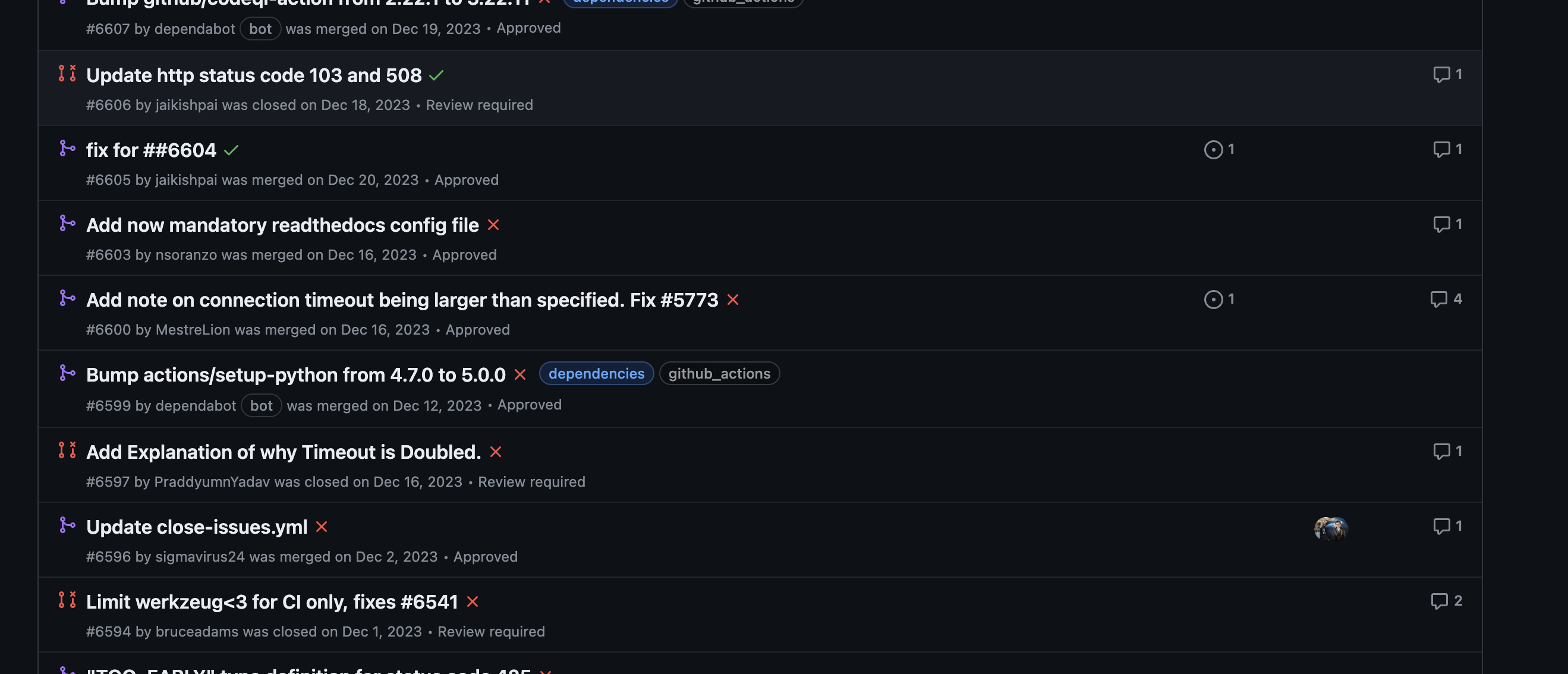 httpbin 메인테이너도 이걸 인지했는지 main 브랜치에는 제대로 import 하고 있다. 하지만 pypi 에 release 권한이 있는 메인테이너가 아직 PR을 수락하지 않아 pypi 내 코드에는 패치가 되어있지 않다!. 그래서 아직 다른 라이브러리들에서 에러가 나는 것이다. 현재 에러가 나는 httpbin:v1.0.1 에서 httpbin:v1.0.2 가 출시될 경우 다른 라이브러리들이 httpbin 버전업만 한다면 문제가 해결될 것이다.