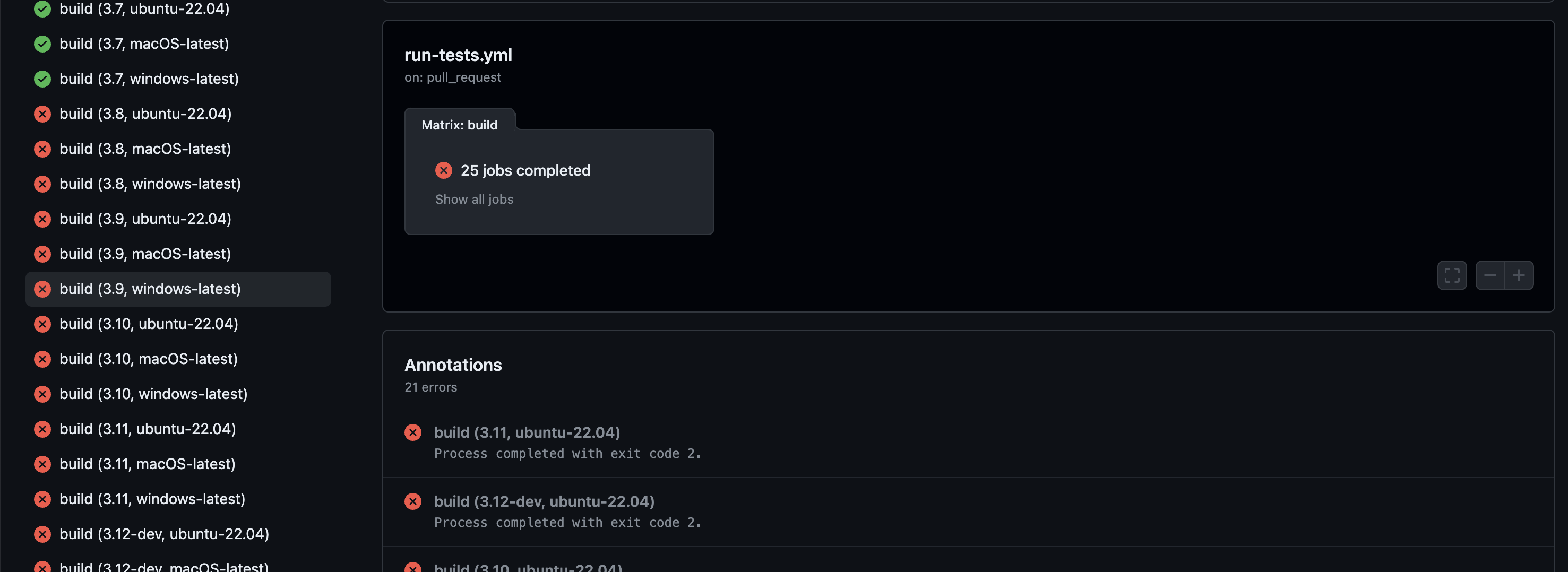파이썬 가상환경(pyenv)에서 pytest 를 해서 의존성 문제도 발생할 수 없을 것 같았고, 내가 모르는 내부적인 에러로 인해 문제가 발생했을 거라 생각하지는 않았다. 그러다 closed 된 pull requests 에서 test 가 통과하지 않은 PR도 main 에 merge 되고 있는 것을 확인했다. 자세히 들여다보니 CI test 가 python 3.7 을 제외한 나머지 버전에서 모두 실패하고 있었다.