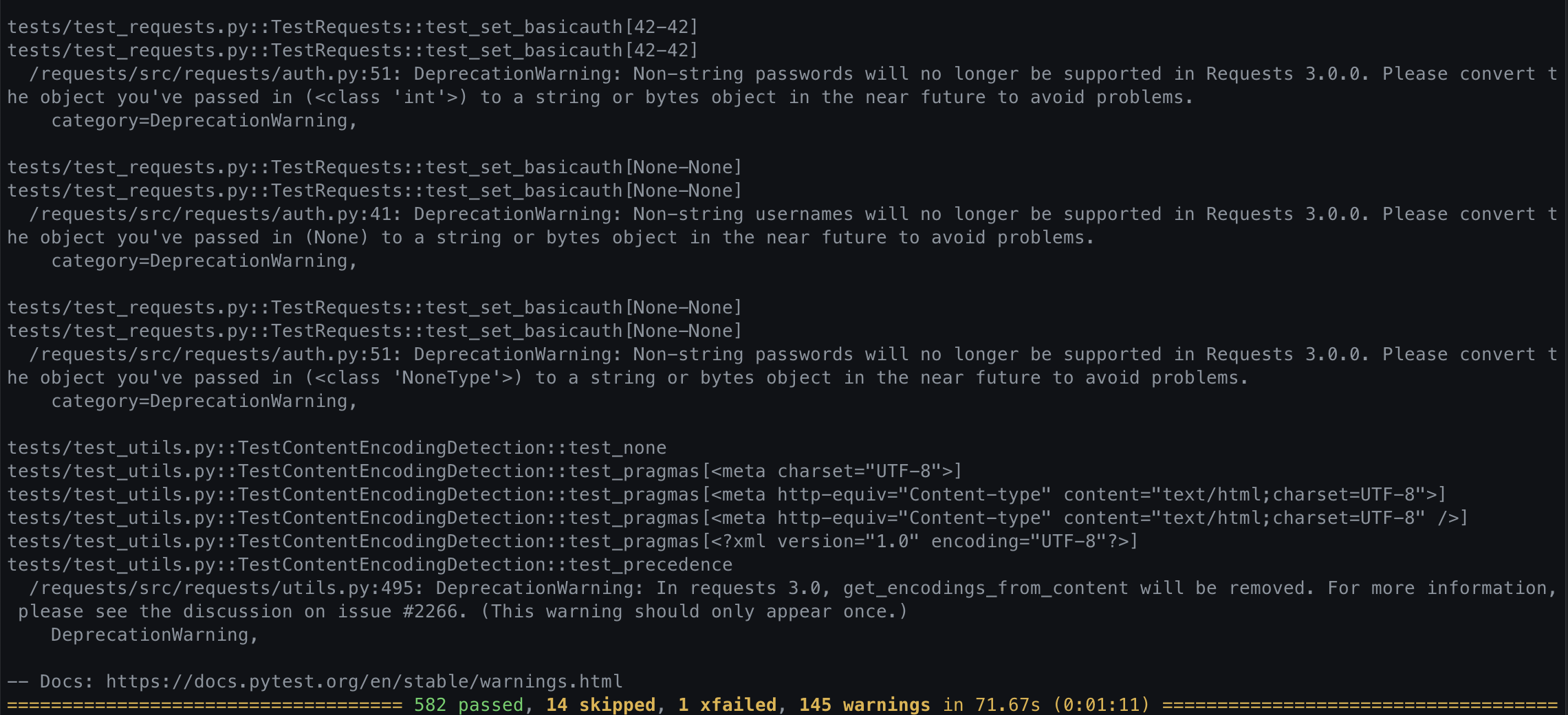 requests v2.31.0 의 test 실행시 발생하는 문제에 대해 알아봤다. requests 가 의존하는 httpbin 에서 발생하는 문제였고, requests 코드 상에서 고칠 수 있는 방법은 없었다. 대신, 설치된 의존성을 다운그레이드하거나 코드를 교체해서 문제를 해결할 수 있었다.