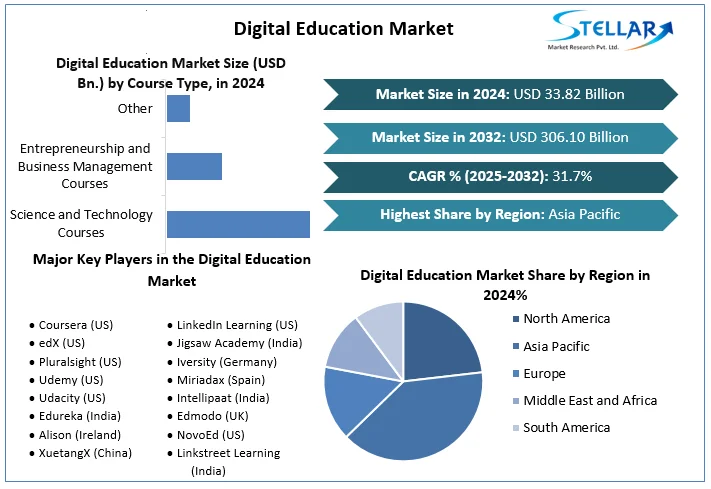 Digital Education Market Industry, also known as e-learning, encompasses the use of digital technologies to facilitate teaching and learning processes. It includes online courses, virtual classrooms, and digital learning materials, enabling learners to access educational content anytime and anywhere. The market's valuation, which stood at USD 33.82 billion in 2024, is projected to reach USD 306.10 billion by 2032, underscoring the accelerating shift toward digital learning platforms.