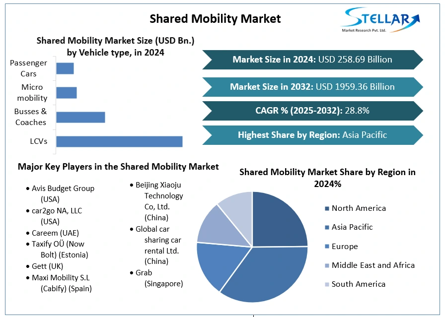 Shared Mobility Market Industry size was valued at US$ 258.69 Billion in 2024 and the total revenue is expected to grow at 28.8% through 2025 to 2032, reaching nearly US$ 1959.36 Billion.